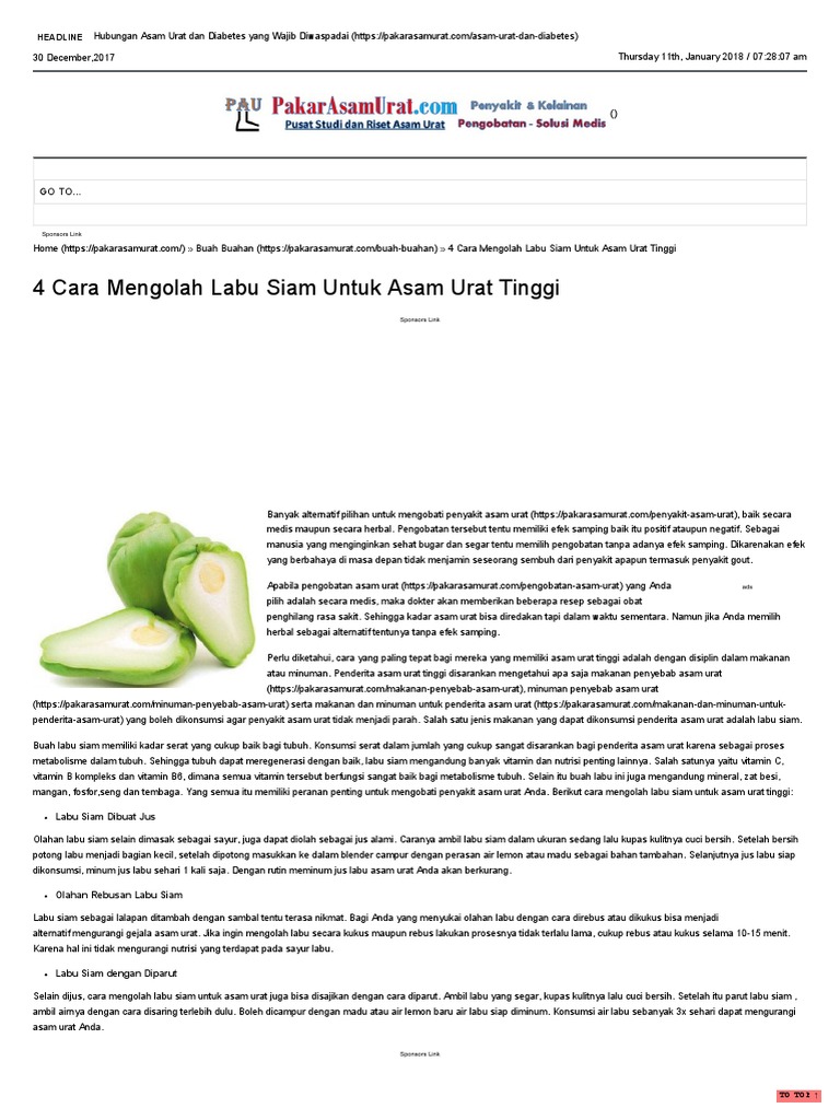 Asam urat adalah masalah kesehatan yang disebabkan kandungan asam urat. Penyakit asam urat merupakan keadaan yang bisa mengakibatkan gejala nyeri yang tidak para lelaki lebih rawan terserang penyakit asam urat dibanding dengan perempuan, terutama ketika umur. Uric acid, urate) adalah senyawa turunan purina dengan rumus kimia c5h4n4o3 dan rasio plasma antara 3,6 mg/dl (~214µmol/l) dan 8,3 mg/dl (~494µmol/l) (1 mg/dl = 59,48 µmol/l). Saat ini tidak hanya orang tua yang bisa terkena penyakit asam urat.
